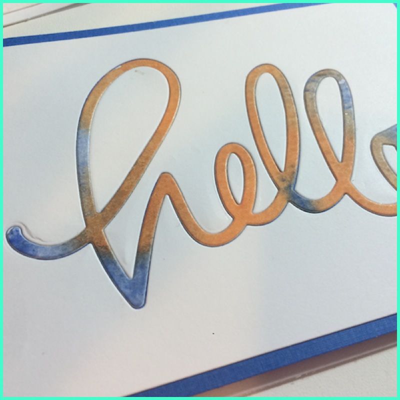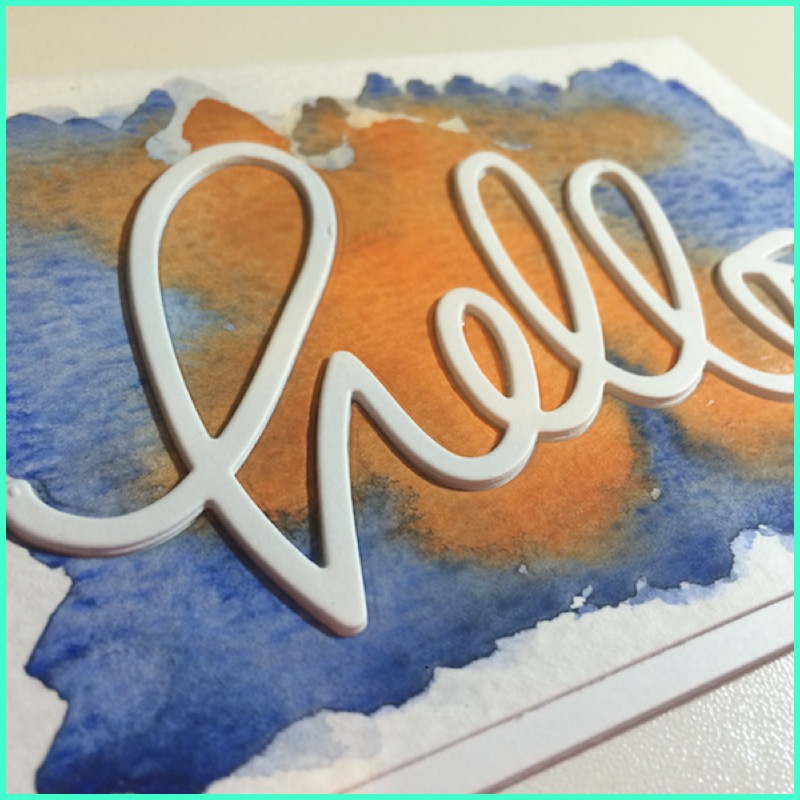 For the first card, I created the orange and blue watercolor background- essentially as easy as wetting a piece of watercolor paper and pooling some orange and blue, allowing it to mix a bit. Then, I ran the dried watercolor piece through my die cutting machine with the “Hello” die. I used the cut out hello and inset it into a white background. I then think cut about 4 white card stock pieces of the “Hello” die, layered them and then inset the layered piece into the watercolor background- creating the raised effect. In the end the extra card took me about 3 extra minutes to assemble.