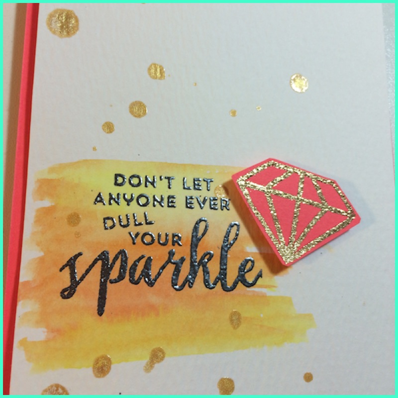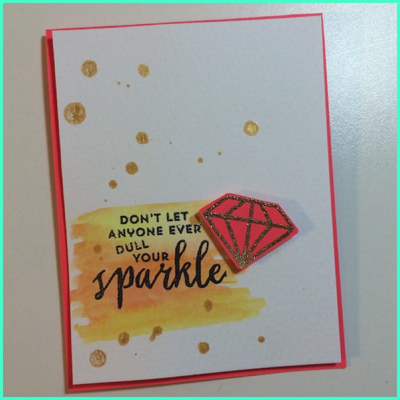 I LOVE this month’s Studio Calico Card kit Stamp. As soon as I saw it, the gem stone stamp immediately reminded of an old stamp quote about “sparkling.” So, I dug through my old stamps and found it- the February Studio Calico “Sugar Rush” stamp! Watch how I used both stamps to make this bright, fun, young card!
