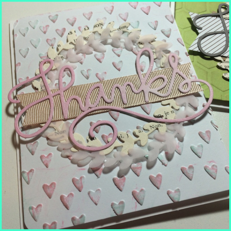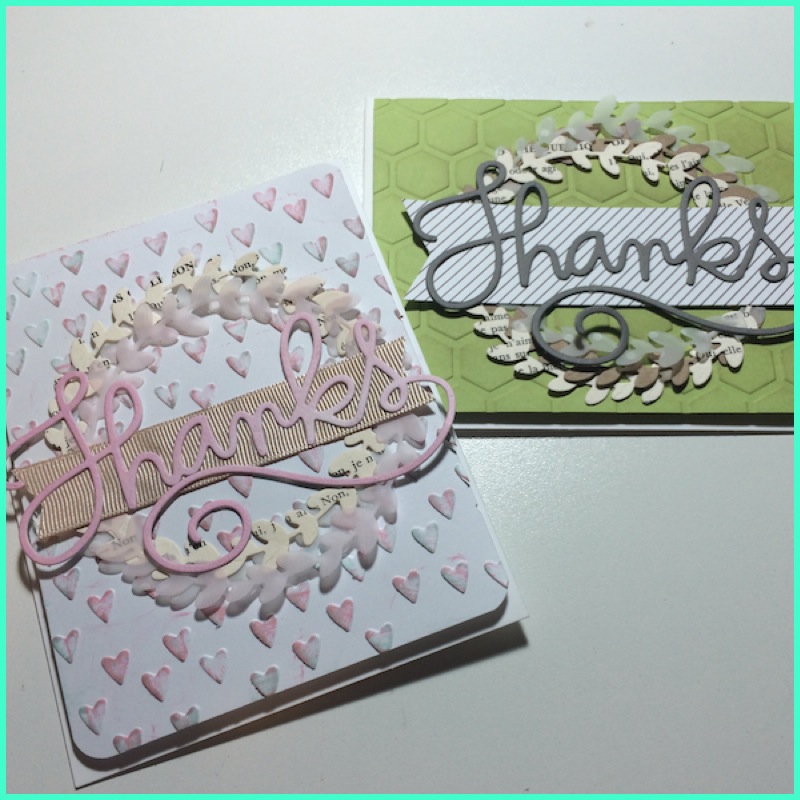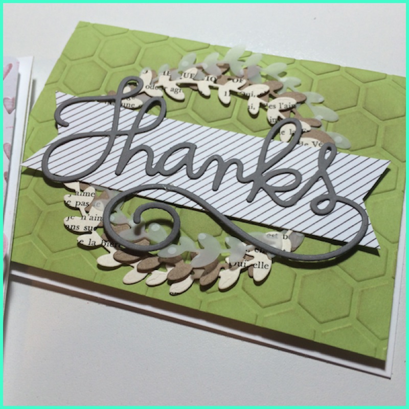 I began by creating two embossed backgrounds. While I was at my die cutting machine, I cut several different “wreath” style cut outs in different colors and paper types- a book page, vellum and card stock. Finally, I cut two versions of the “Thanks” die.