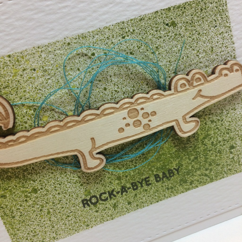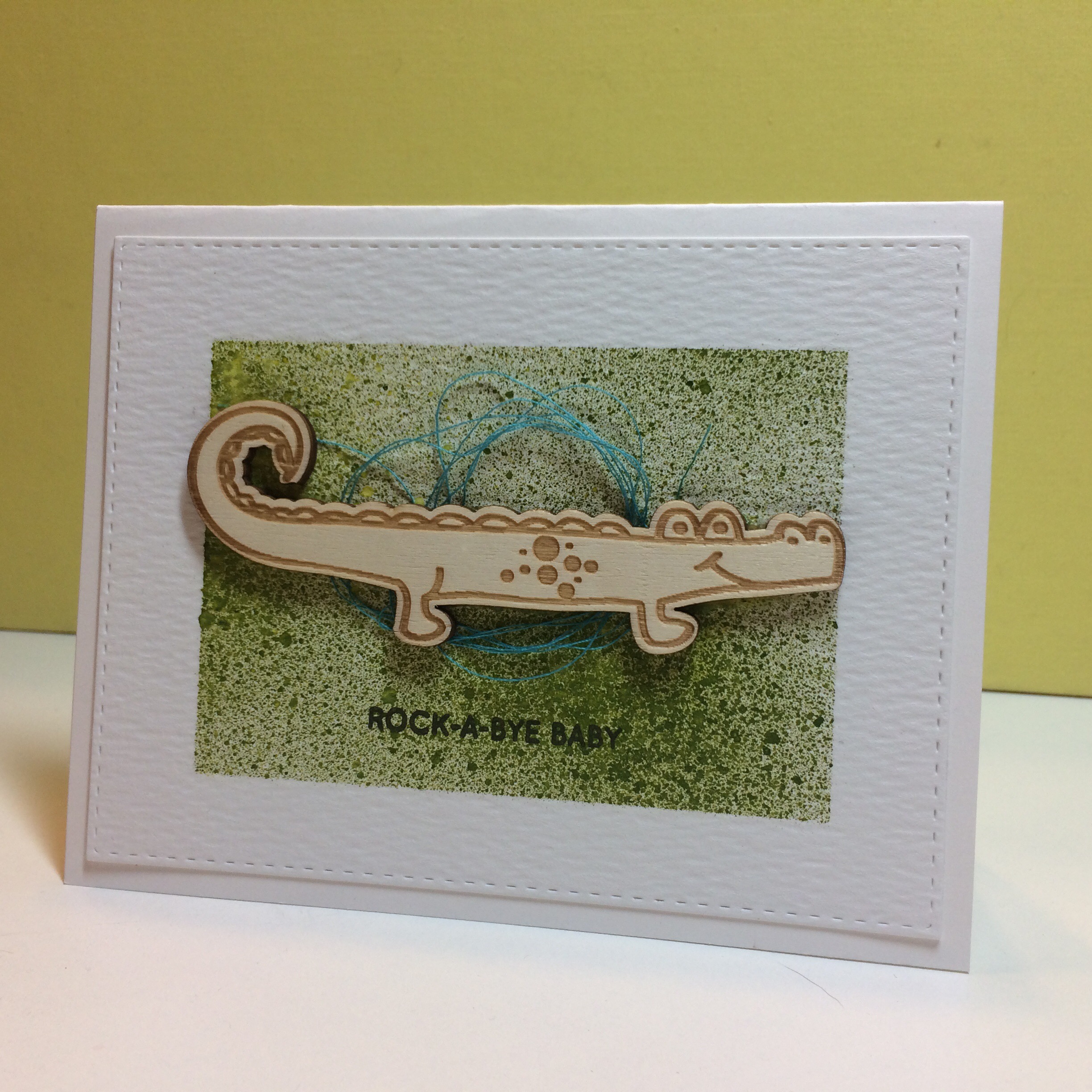 When a fellow Gator has a new baby, nothing but a gator-themed card will do! Tried to keep it soft with the most background and thread behind the wood veneer gator.