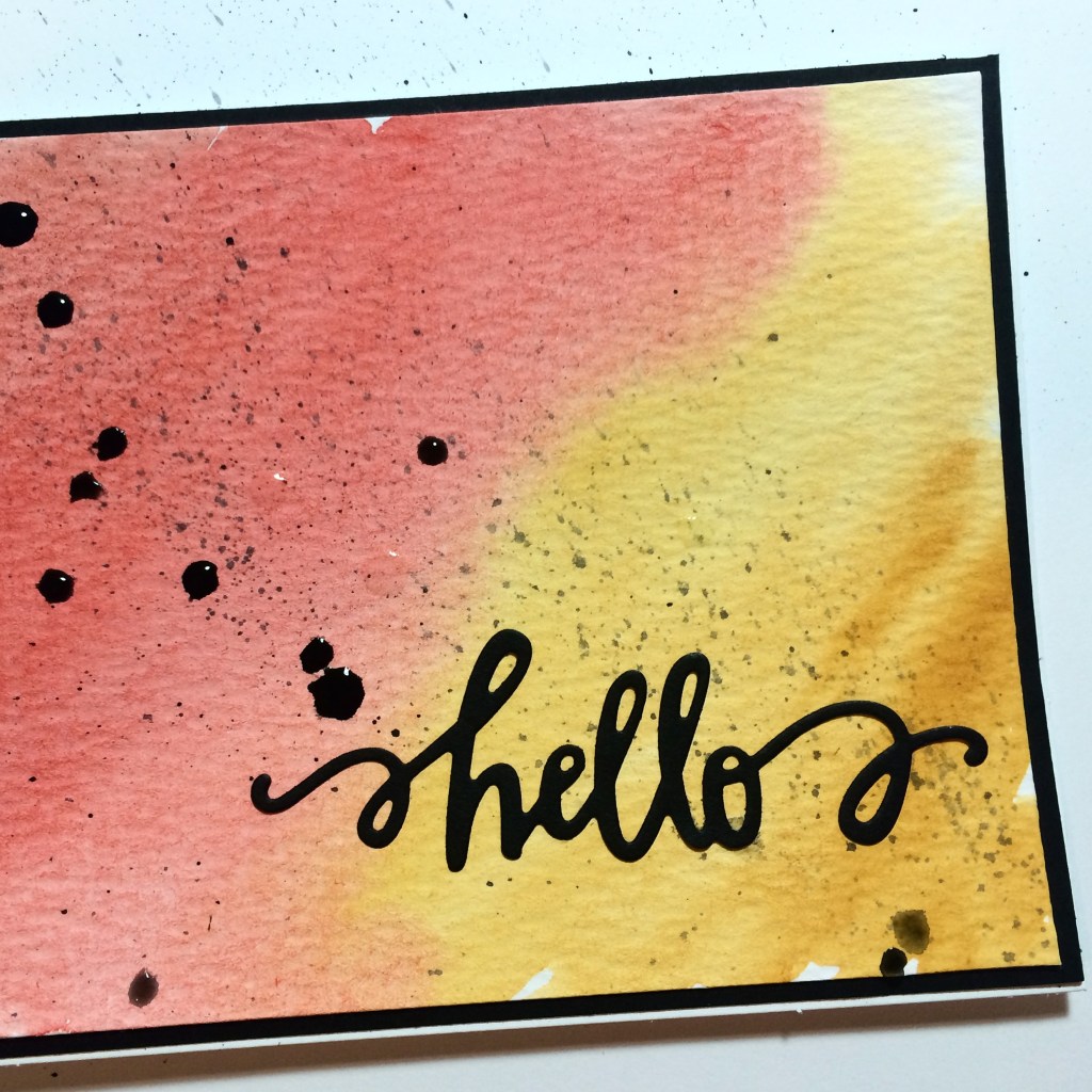 A card with watercolor and splatters as the focal point and a simple script-y die cut in the corner.