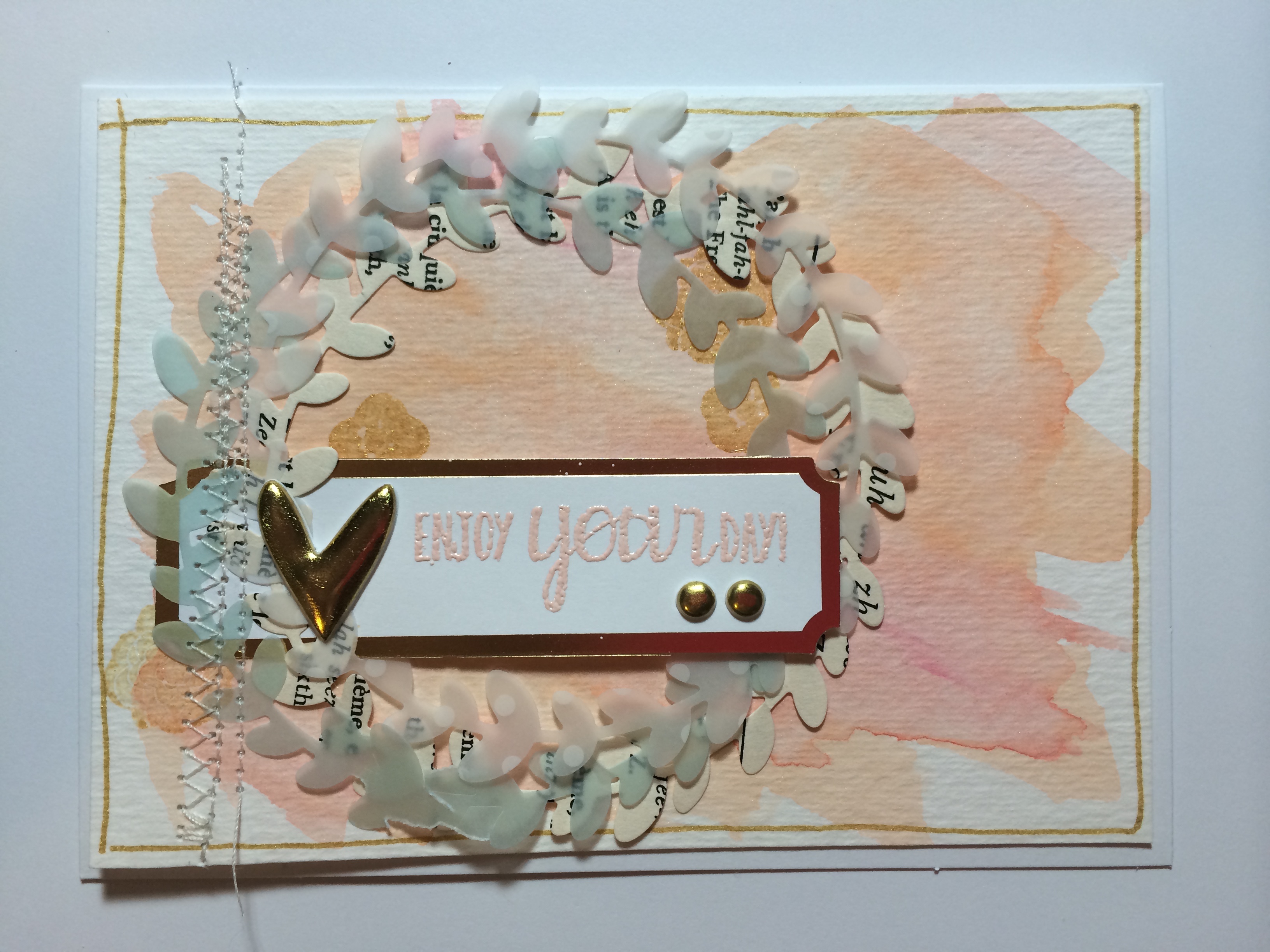 I’m clearly on a roll with the watercolor- I love this pink and peach palette. Also loved the wreath diecut in varying paper types, stitched on with a messy zig-zag line.