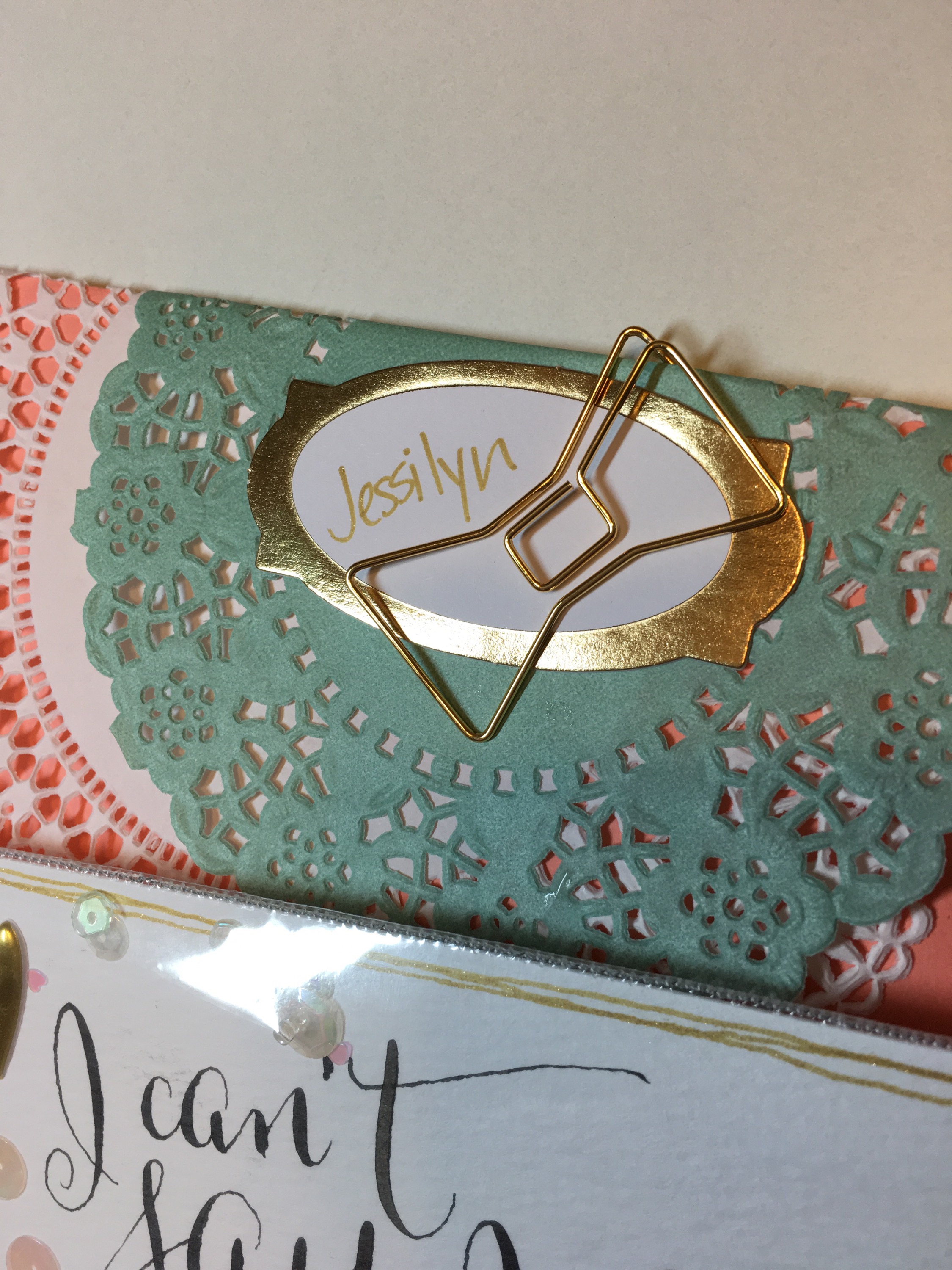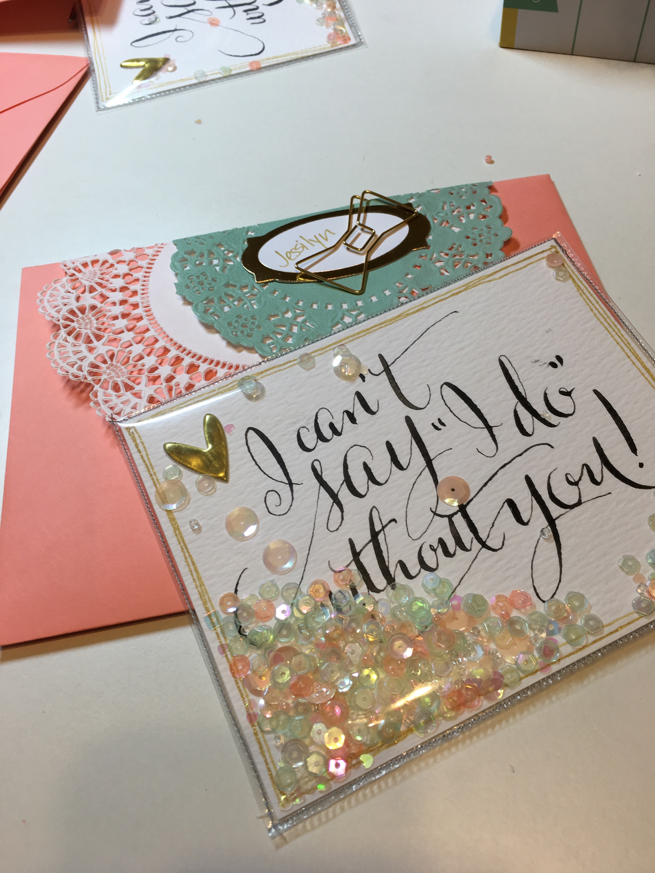I did the lettering in calligraphy and placed that in a sewn picket filled with sparkle-y goodness. I added some pretty Kate Spade bow paper clips and dollies to the envelope to finish it off. Love these so much!