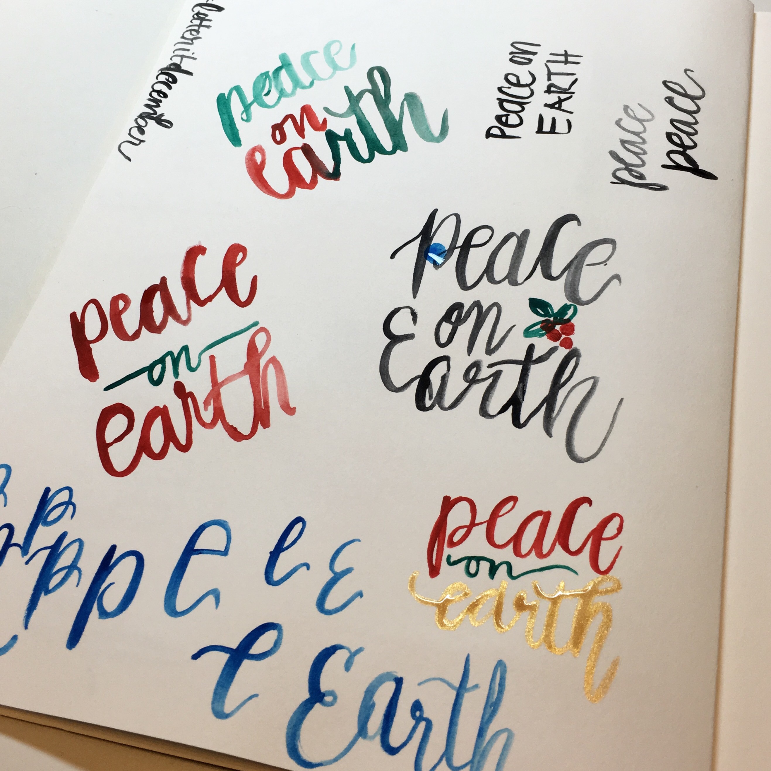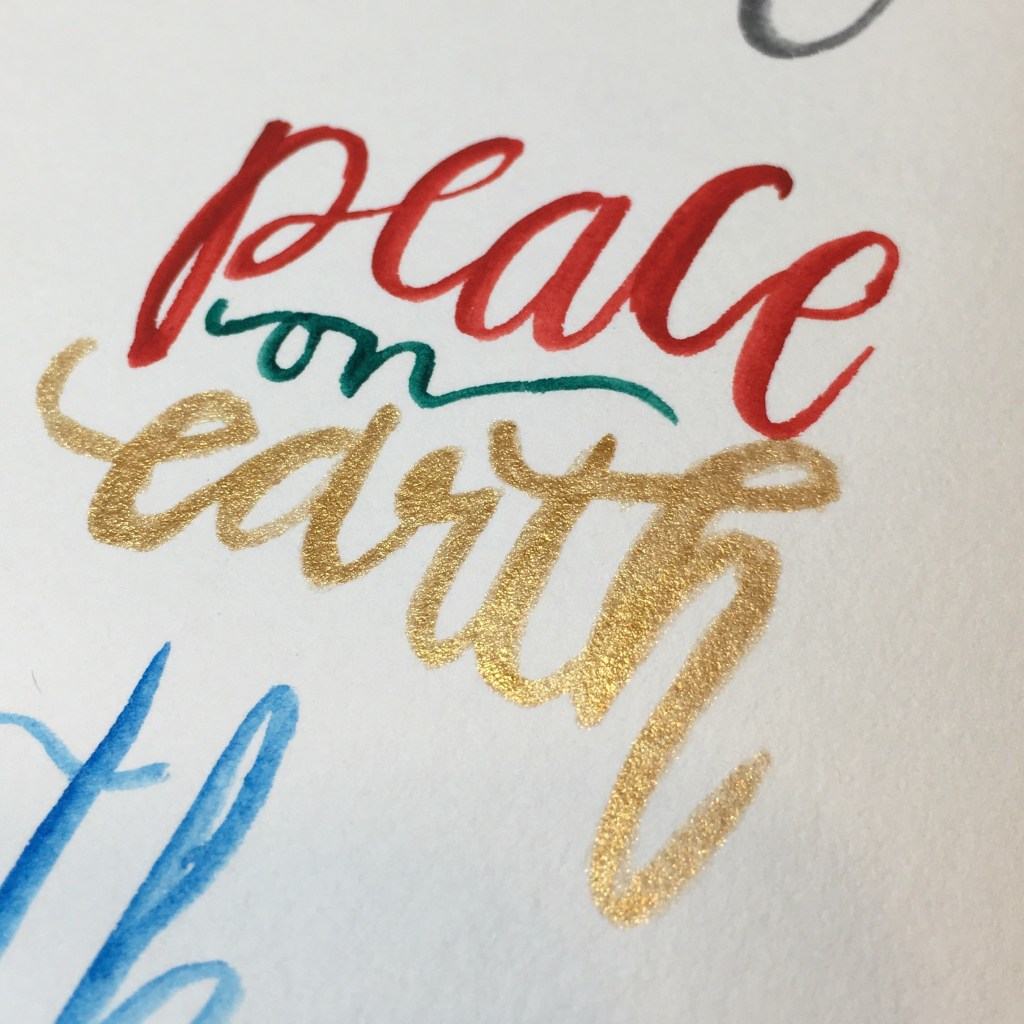Here’s day 1 challenge attempt at lettering the phrase “peace on earth.” In the end, I liked the version that brought in the metallic gold ink- no surpise there 🙂