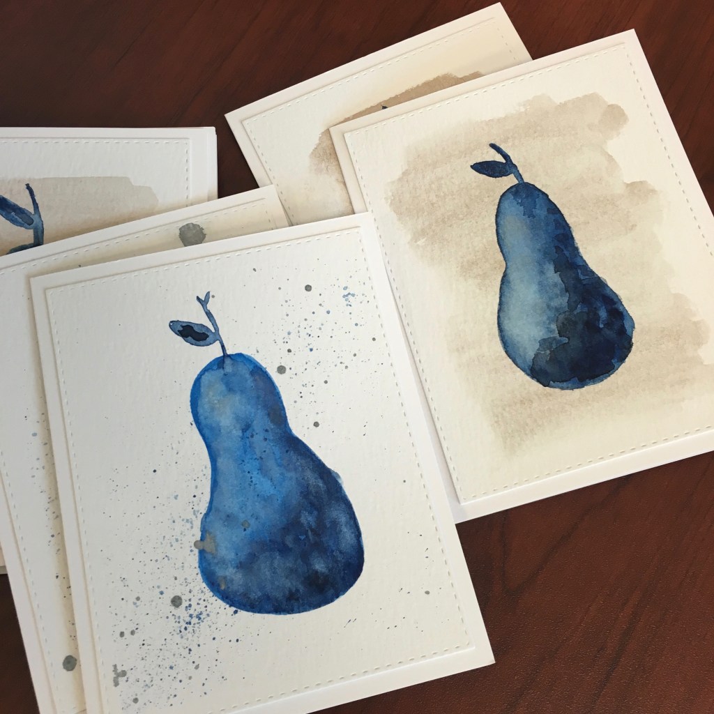 How beautiful are these gorgeous pears? I was commissioned to make this card set for a woman who has a business called “Sapphire Pear”- hence, the blue theme.
