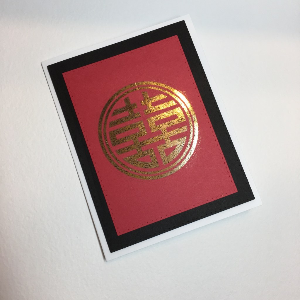 I was commissioned to make a gift card set that had a Chinese theme. I knew I wanted to incorporate gold foil and thought using a mandala-type image would be a good option. I found this “double-happiness” image and liked the idea! I matted the gold-foil image with black and red cardstock for a clean, strong image.
