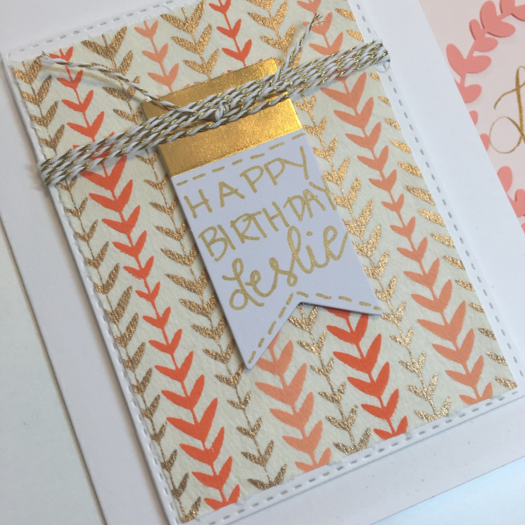 I typically refrain but could not pass up this beautiful gold and coral leaf pattern. I’ve used it on a couple projects since, including this pretty birthday card with a simple tag and gold twine wrapped around.
