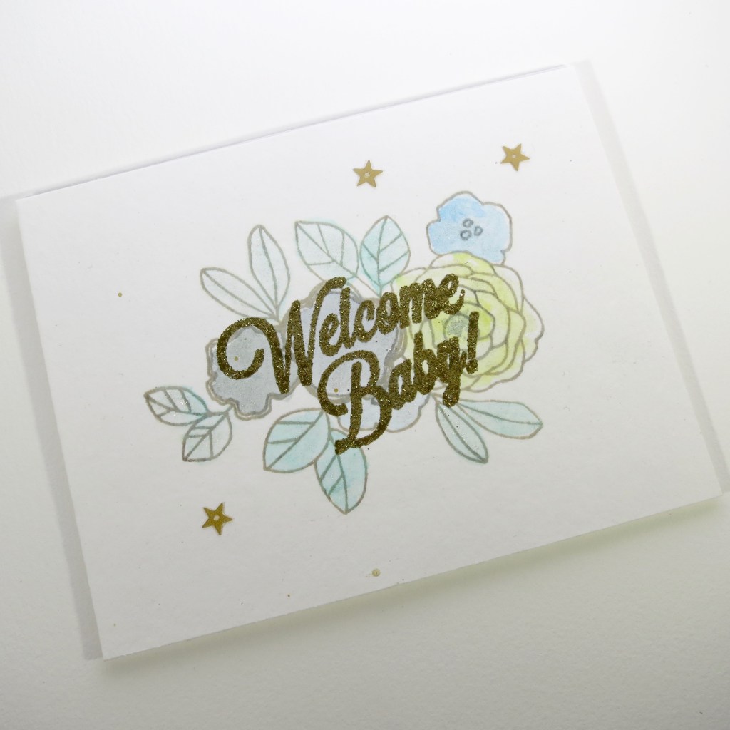 Some cards I particularly look forward to creating- this card to my cousin for her first baby is a perfect example! I stamped a flower background and painted in the flowers using a soft watercolor palette. I then embossed the “Welcome Baby” sentiment across the front in gold, glittery lettering.
