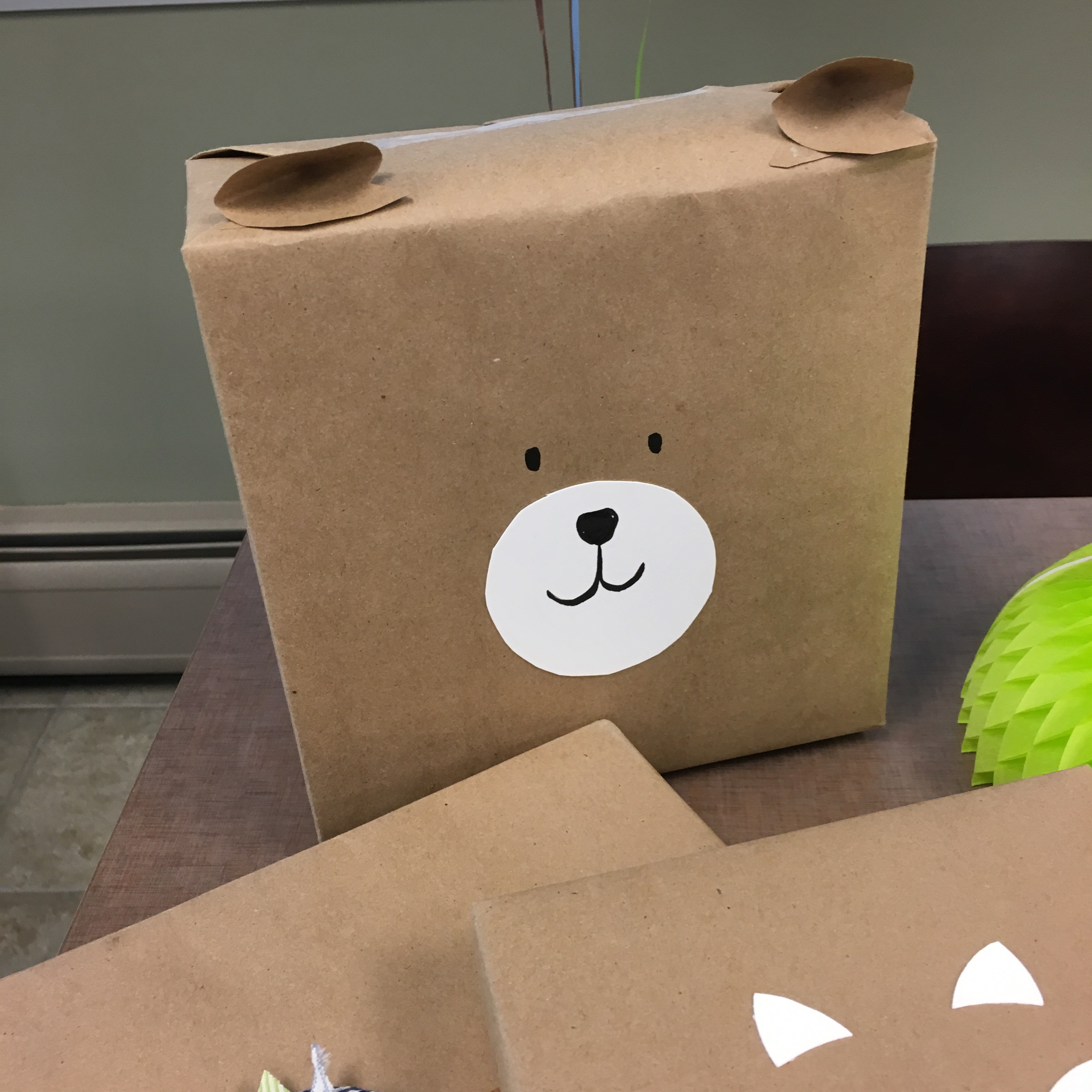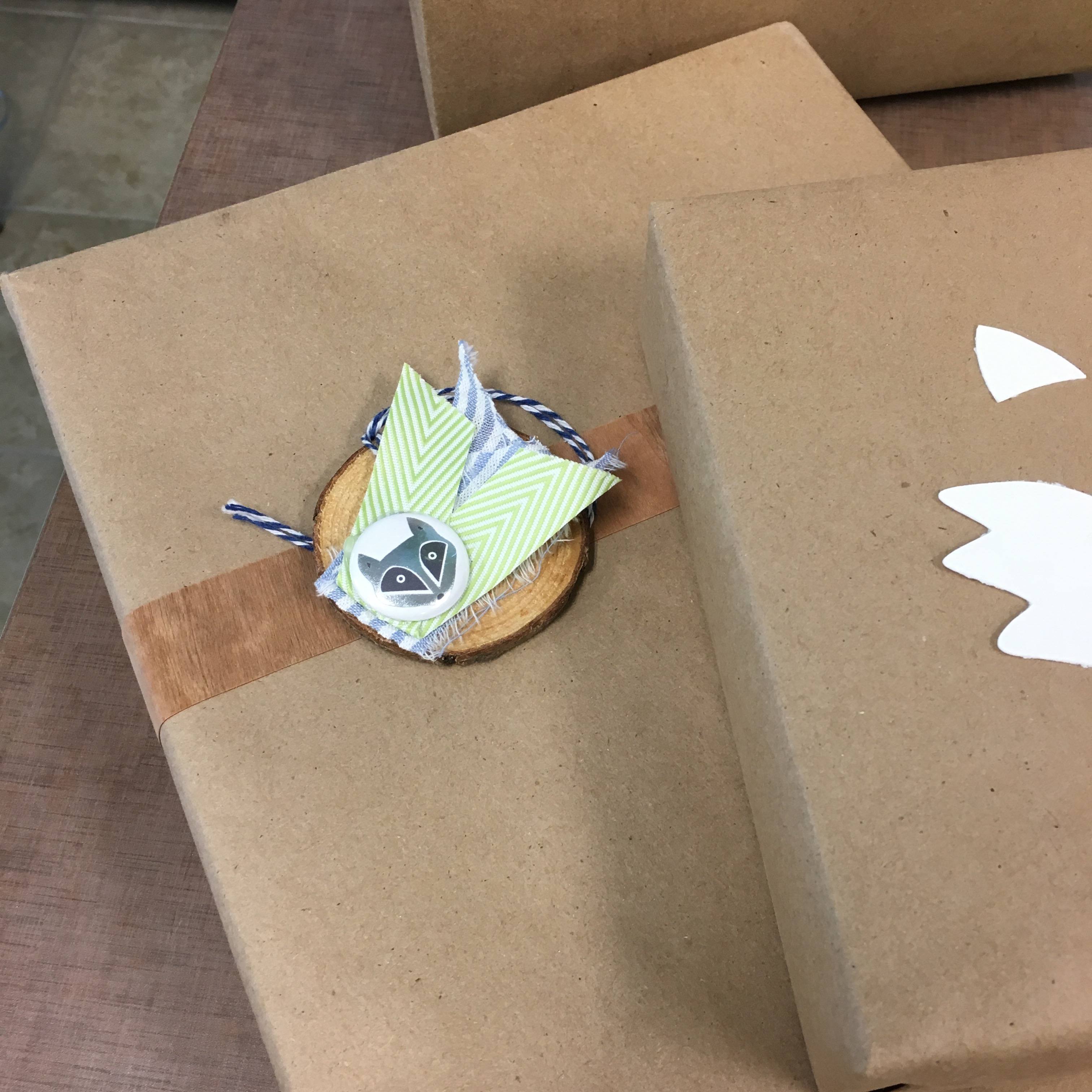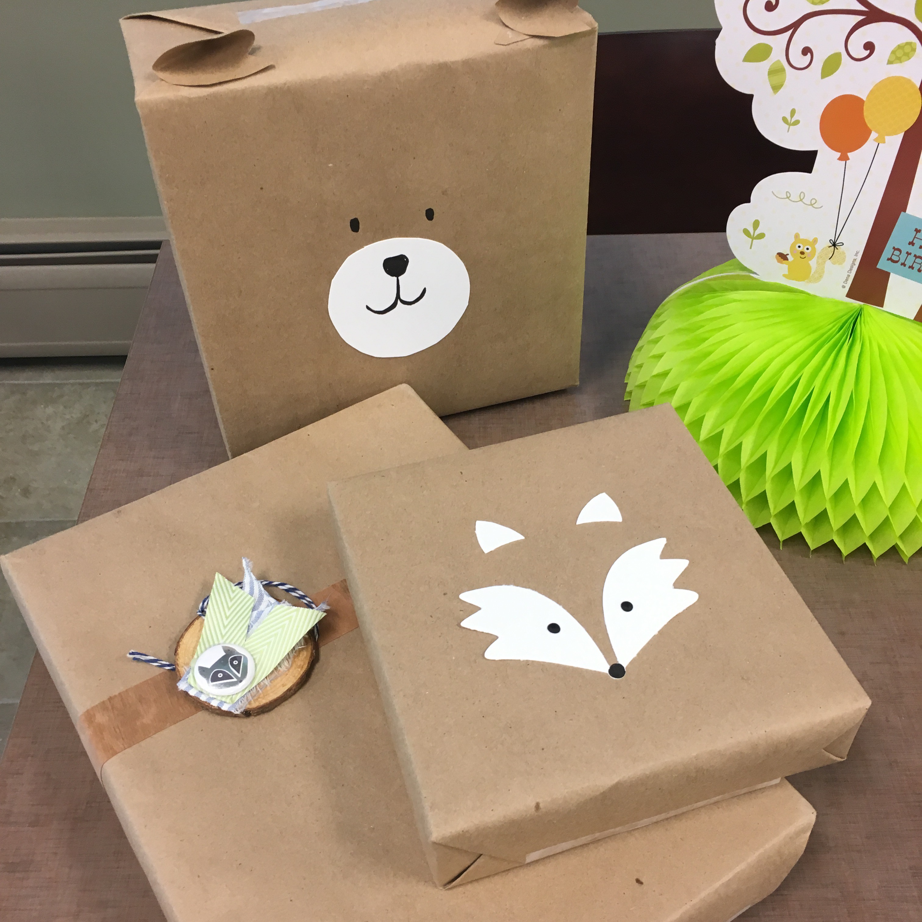 The packaging counts! A friend’s baby shower gifts, wrapped to match the woodland animal theme of the shower!