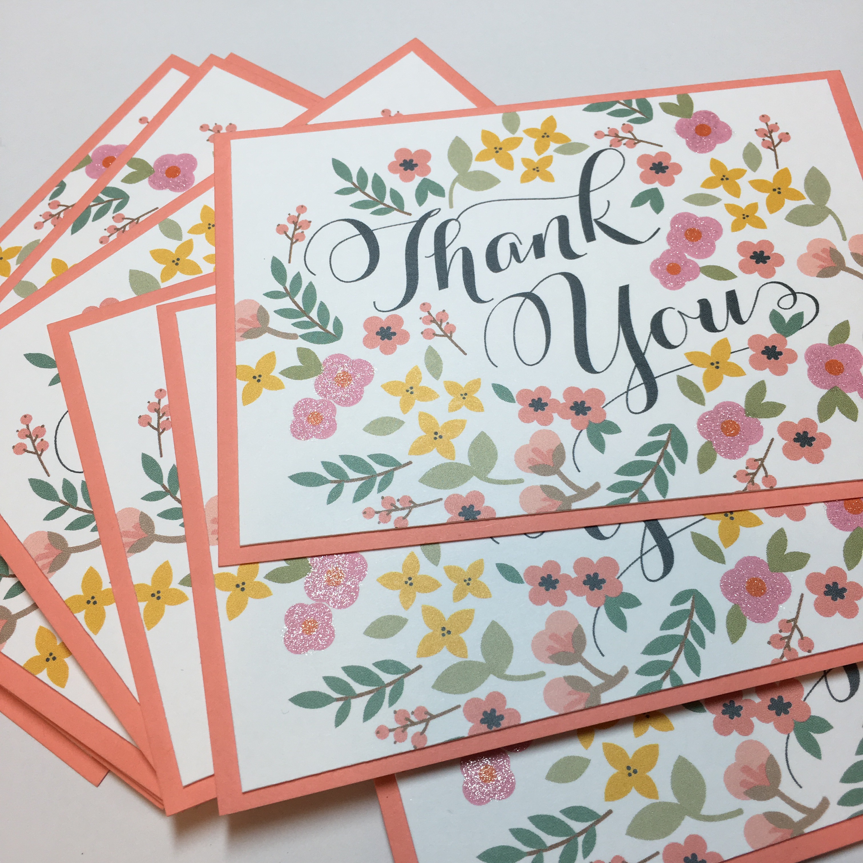 I had a stack of bridal shower thank you notecards from last year. I repurposed them by adhering to a coral colored card and adding some shimmer to the flowers.