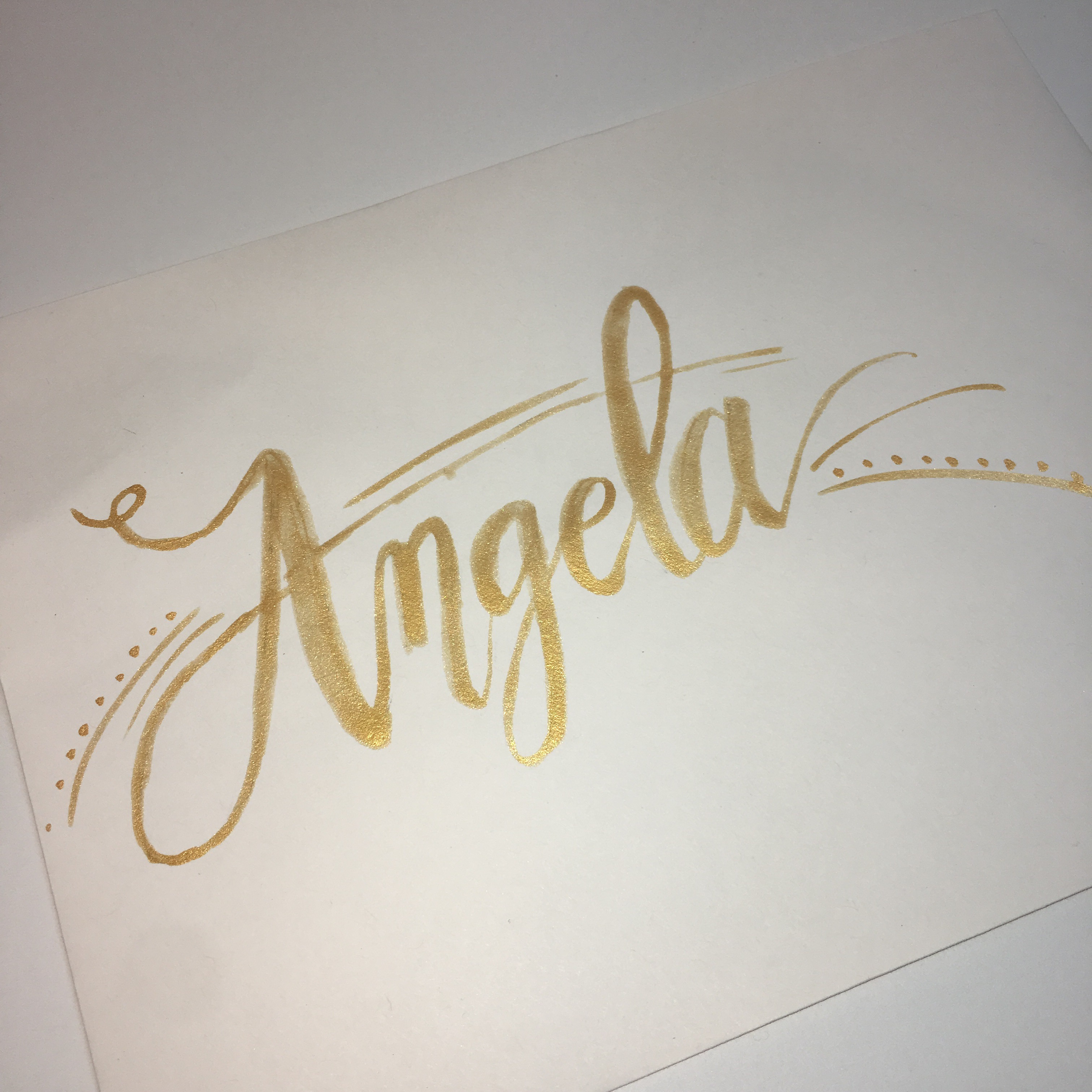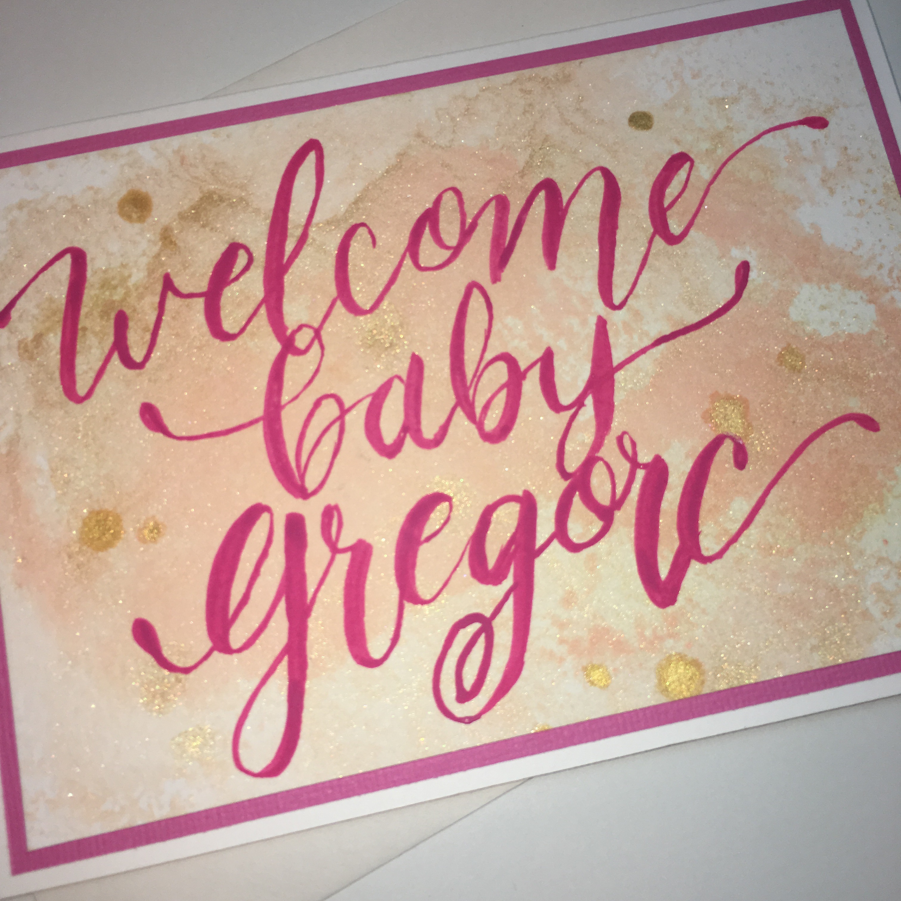 Love the peach watercolor background with gold splatters that serve as the background to the bright pink lettering message.